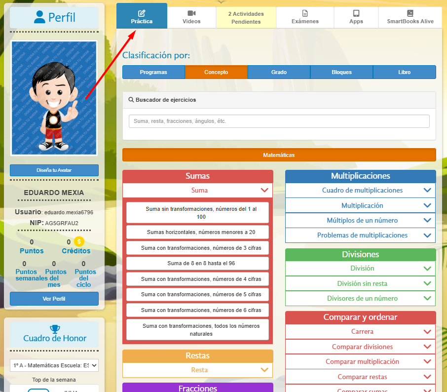 En la página principal del perfil del alumno, en la pestaña Practica se encuentran todos los ejercicios organizados y clasificados en 5 categorías: